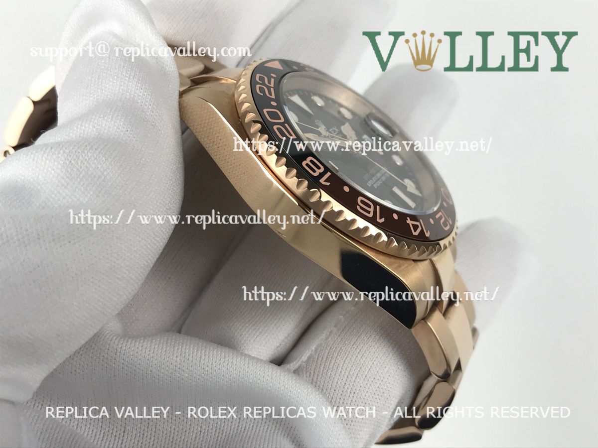 Model: 18K Rose Gold Plated Stainless Steel Caseset, Bezel and Crown, Brown/Black Rootbeeer Ceramic Insert (Bi Directional Rotating GMT Bezel), 1-1 Dimension and Profile as per Genuine, Rehaut Height and Depth as per Genuine, Reptitive ROLEXROLEX Engraviing with Model and Individual Alpha Numeric Serial Numbers